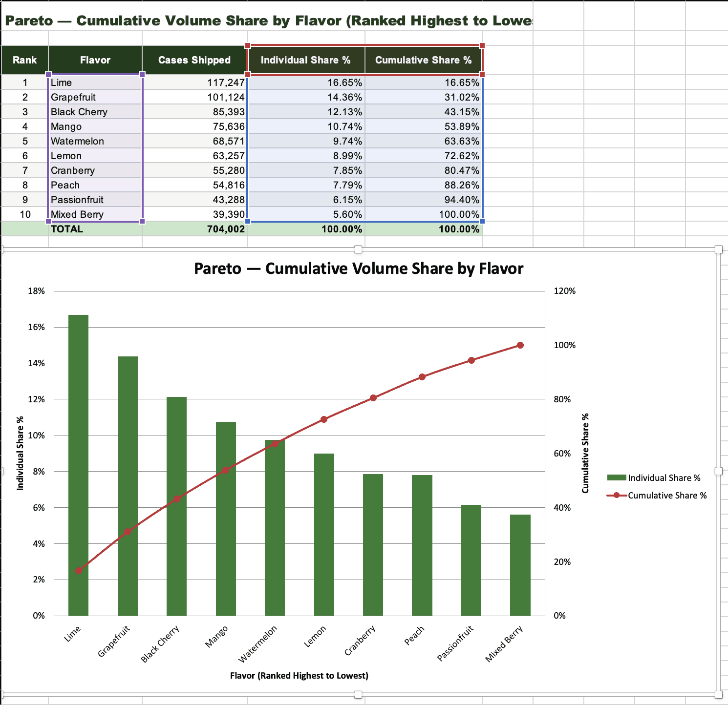 Say I have a booming seltzer enterprise, with 18 months of shipment data across 10 flavors. Let's also say I need a workbook with a monthly volume trend and a SKU mix breakdown.